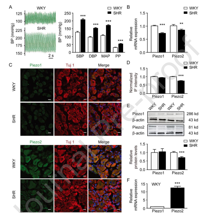 Piezo2 Was Dominantly Expressed in NG Neurons in WKY Rats and Downregulated in Hypertensive Rats Recent studies have shown that both Piezo1 and Piezo2 MA channels are obviously expressed in the mouse NG neurons. In the present study, SHR and L-NNA- or Ang II-induced hypertensive model rats were used to address the different expression of Piezo1 and Piezo2 in NG between normotensive WKY rats and hypertensive rats. The carotid artery intubation method was used to record the BP of WKY rats and SHR. The SBP, DBP, MAP and PP were all significantly higher in SHR than that of WKY rats (Figure 1A). qPCR assay showed that the mRNA of both Piezo1 and Piezo2 in the NG of SHR were significantly lower than that of WKY rats by 27.8 percent (P less than 0.001) and 15.2 percent (P less than 0.01), respectively (Figure 1B). Immunostaining assays were also performed (Figure 1C). In the NG neurons of WKY rats, the immunofluorescence (IF) of Piezo2 was obviously displayed, however, the IF of Piezo1 was hardly detected (Figure 1C). Moreover, the IF intensity of Piezo2 in the NG neurons of SHR was significantly reduced by 25 percent (P less than 0.001), while, the IF intensity of Piezo1 had no significant alterations (Figure 1C and D). Both qPCR and immunostaining assays indicated that Piezo2 expressed at higher levels in the NG of WKY rats and significantly downregulated in the NG of SHR (Figure 1B-D). Consistent with these results, western blot assay clearly showed that Piezo2 but not Piezo1 dominantly expressed in the NG of WKY rats, and its expression was significantly reduced by 32.2 percent (P less than 0.001) in the NG of SHR (Figure 1E). Indeed, qPCR assay showed that Piezo2 expression was about 12.5-fold higher than that of Piezo1 (P less than 0.001) at the mRNA level in the NG of WKY rats (Figure 1F). These results indicate that Piezo2 dominantly expresses in NG neurons of normotensive WKY rats and significantly downregulated in NG neurons of SHR.